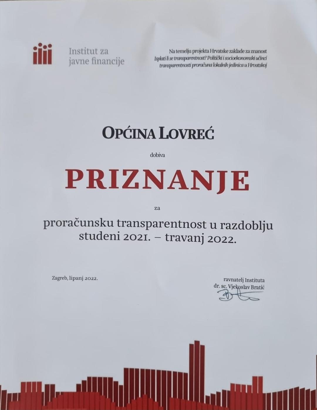 Istraživanje se odnosilo na proračunsko razdoblje studeni 2021. – travanj 2022., a kako općina Lovreć permanentno radi na podizanju transparentnosti i vidljivosti, za očekivati je da ćemo napredovati  više i nastviti ostvarivati odlične rezultate.