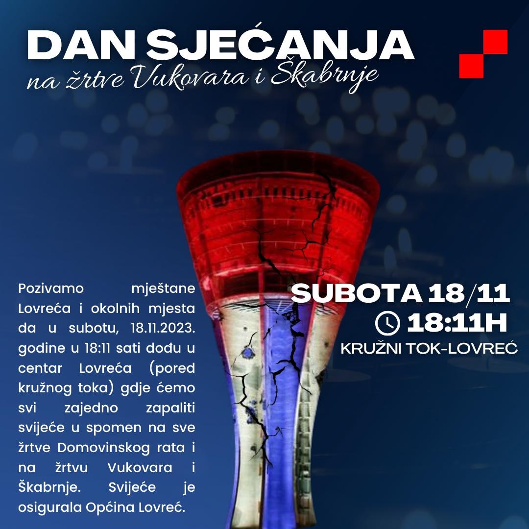 Pozivamo sve mještane Općine Lovreć i okolnih mjesta u subotu (18.11) na kružni tok u središtu Lovreća gdje ćemo točno u 18:11 zapaliti svijeće u spomen na stradale i time izraziti svoje poštovanje, zahvalnost i sućut.