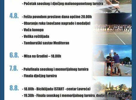 Tako će i 4. Kolovoza u večernjim satima biti organizirana zabava sa sportskim događanjima i velikom roštiljadom. Sve to bit će popraćeno glazbenim ugođajem tamburaškog sastava Mediteran. Neće izostati ni vjerski sadržaji s procesijom i svetom misom na zavjetni blagdan Gospe Lurdske. Ove godine će biti i velika biciklistička utrka u dužini od 26 kilometara od Lovreća preko Studenaca, Sviba i Ciste Provo do Lovreća s velikim nagradnim fondom. Uz uvijek posjećene malonogometne utakmice sve će se završiti predstavom monodramskih tekstova našega Ivana Raosa koju će izvoditi glumac Trpimir Jurkić kojega će na kraju pratiti klapa Kučine. Svima vama koji ste se odlučili provesti svoj godišnji odmor na Lovreću iskoristite to na najbolji mogući način posjetom programu Lovrećkog lita koji je najvećim djelom kreiran i zbog vas.
